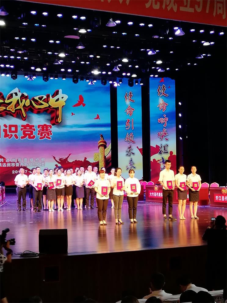 快訊 為慶祝中國(guó)共產(chǎn)黨建黨97周年,7月2日,達(dá)州市兩新組織在巴山大劇院隆重舉行了“黨在我心中”知識(shí)競(jìng)賽決賽。達(dá)州市城鎮(zhèn)公用行業(yè)協(xié)會(huì)聯(lián)合黨支部朱芳玲(四川森博能源有限公司職工),黨建指導(dǎo)員、市委統(tǒng)戰(zhàn)部經(jīng)濟(jì)科科長(zhǎng)黎秋,市現(xiàn)代物流行業(yè)協(xié)會(huì)副書記向琦等三同志代表市社會(huì)組織第二綜合黨委參加了知識(shí)競(jìng)賽決賽,通過緊張激烈的競(jìng)賽,獲得了二等獎(jiǎng)的優(yōu)異成績(jī),為社會(huì)組織第二綜合黨委和本單位爭(zhēng)得了榮譽(yù)。