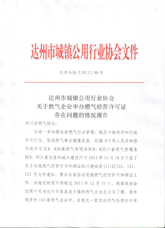 根據(jù)我協(xié)會(huì)近兩個(gè)月對(duì)各然氣企業(yè)的走訪與了解,通過(guò)各種形式收集關(guān)于辦理燃?xì)饨?jīng)營(yíng)許可證中存在的問(wèn)題與建議,協(xié)會(huì)張會(huì)長(zhǎng)一行于2013年10月16日專程赴成都,先后向四川省燃?xì)鈪f(xié)會(huì)秘書(shū)長(zhǎng)左卓和四川省住房和城鄉(xiāng)規(guī)劃建設(shè)處處長(zhǎng)黃潔匯報(bào)了關(guān)于我市然氣企業(yè)申辦燃?xì)饨?jīng)營(yíng)許可證的整體情況以及在申辦過(guò)程中存在的若干問(wèn)題。省住建廳城建處黃處長(zhǎng)和省燃協(xié)左秘書(shū)長(zhǎng)首先對(duì)我協(xié)會(huì)所做的工作給予了充分肯定,然后就協(xié)會(huì)提交的《關(guān)于然氣企業(yè)申辦燃?xì)饨?jīng)營(yíng)許可證存在問(wèn)題的情況報(bào)告》(達(dá)市公協(xié)[2013]08號(hào))文件進(jìn)行了相關(guān)的回復(fù)與解釋,具體內(nèi)容如下: 1.因現(xiàn)有的《四川省燃?xì)夤芾項(xiàng)l例》與《城鎮(zhèn)燃?xì)夤芾項(xiàng)l例》(國(guó)務(wù)院令第583號(hào))部分條款相沖突,故四川省住建廳目前正在修訂《四川省燃?xì)夤芾項(xiàng)l例》,在新的《四川省燃?xì)夤芾項(xiàng)l例》未出臺(tái)前,暫停全省供氣區(qū)域核準(zhǔn)文件的辦理。但各然氣企業(yè)現(xiàn)在依然可以向省住建廳上報(bào)提交供氣區(qū)域相關(guān)的文件及資料,以前上報(bào)了的或還未上報(bào)的然氣企業(yè),現(xiàn)在都可以上報(bào)給省住建廳,省住建廳會(huì)根據(jù)新的《四川省燃?xì)夤芾項(xiàng)l例》一次性進(jìn)行審批。 2.企業(yè)在申報(bào)辦證過(guò)程中其公司注冊(cè)資金低于川城建發(fā)(2012)520號(hào)文件中最低標(biāo)準(zhǔn)的,必須進(jìn)行增資或重組、合并等以達(dá)到最低經(jīng)營(yíng)規(guī)模標(biāo)準(zhǔn)。企業(yè)注冊(cè)資金不夠,某種程度上會(huì)相應(yīng)減少安全投入,一旦企業(yè)生產(chǎn)帶來(lái)安全事故或遇突發(fā)事故等,企業(yè)就缺乏賠償能力,致使多方利益受損,甚至造成政府“買(mǎi)單”,故省住建廳特別強(qiáng)調(diào)企業(yè)經(jīng)營(yíng)規(guī)模必須依照川城建發(fā)(2012)520號(hào)文件執(zhí)行。 3.省住建廳根據(jù)全省各地方上報(bào)的關(guān)于辦證的意見(jiàn),近期將出臺(tái)具體文件對(duì)川城建發(fā)(2012)520號(hào)文件中要求企業(yè)技術(shù)職稱人員最低配備標(biāo)準(zhǔn)進(jìn)行調(diào)整,原520號(hào)文件中的技術(shù)人員數(shù)量不作調(diào)整,只在原有燃?xì)庀嚓P(guān)專業(yè)的技術(shù)職稱人員基礎(chǔ)上,增加建筑類專業(yè)職稱技術(shù)人員,放寬專業(yè)條件以助企業(yè)解決技術(shù)力量薄弱的問(wèn)題。同時(shí)省住建廳網(wǎng)站上于2013年9月30日下發(fā)了《關(guān)于2013年下半年申報(bào)建筑工程中初級(jí)專業(yè)技術(shù)職務(wù)任職資格的通知》,各然氣企業(yè)可根據(jù)企業(yè)技術(shù)人員自身情況及時(shí)進(jìn)行申報(bào),以免錯(cuò)過(guò)最佳評(píng)審時(shí)期。企業(yè)專業(yè)技術(shù)人員必須一人一崗,不可兼職;管理崗位的管理人員可身兼多職,但必須有管理崗位職業(yè)資格證書(shū)。 4.企業(yè)在申報(bào)燃?xì)饨?jīng)營(yíng)許可證中,如企業(yè)無(wú)獨(dú)立法人資格,其工商營(yíng)業(yè)執(zhí)照不是以獨(dú)立法人注冊(cè)的,必須變更營(yíng)業(yè)執(zhí)照為獨(dú)立法人注冊(cè),只有獨(dú)立的法人資格才能進(jìn)行申報(bào),否則省住建廳不予審批。特殊情況除外,如“中石油、中石化”,他們由國(guó)資委監(jiān)管,有特別規(guī)定不允許其子公司下設(shè)獨(dú)立法人,在申報(bào)辦證時(shí)必須出具由總公司獨(dú)立法人簽署的授權(quán)書(shū)加相關(guān)職能部門(mén)簽署的情況說(shuō)明方可有效。 5.為進(jìn)一步加強(qiáng)全省燃?xì)庑袠I(yè)管理,規(guī)范市場(chǎng)秩序和行政許可行為,促進(jìn)燃?xì)馐聵I(yè)健康發(fā)展,省住建廳在逐漸完善相關(guān)燃?xì)夤芾項(xiàng)l例,F(xiàn)對(duì)經(jīng)營(yíng)液化石油氣但不包括配送銷售瓶裝液化石油氣的企業(yè),是否需要配備瓶裝液化氣專用車輛的權(quán)限下放到各地市州燃?xì)庵鞴懿块T(mén),不作硬性的規(guī)定。但在完善的過(guò)程中省住建廳可能會(huì)出臺(tái)相關(guān)的規(guī)定,鼓勵(lì)各然氣企業(yè)在經(jīng)營(yíng)液化石氣時(shí)必須建立完整的配送體系,并且將經(jīng)營(yíng)站與配送站分開(kāi),在提供優(yōu)質(zhì)服務(wù)的同時(shí)以減少安全隱患。如若建立了配送站就必須配備瓶裝液化石油氣專用車輛。 6.企業(yè)與石油部門(mén)簽定的交接點(diǎn)壓力,不可代替供氣合同,不能作為穩(wěn)定氣源供應(yīng)的證明。根據(jù)《城鎮(zhèn)燃?xì)夤芾項(xiàng)l例》規(guī)定,燃?xì)夤静坏棉D(zhuǎn)供氣,且中石油日后在供氣給然氣企業(yè)時(shí),會(huì)審查企業(yè)是否有燃?xì)饨?jīng)營(yíng)許可資格,如沒(méi)有則不予供氣。 7.企業(yè)由于建立較早,相關(guān)建設(shè)項(xiàng)目核準(zhǔn)或備案文件以及相關(guān)工程建設(shè)規(guī)劃資料辦理手續(xù)以及相關(guān)職能部門(mén)審核批復(fù)流程與現(xiàn)在不一樣,導(dǎo)致部分文件缺失的,針對(duì)此問(wèn)題有三種解