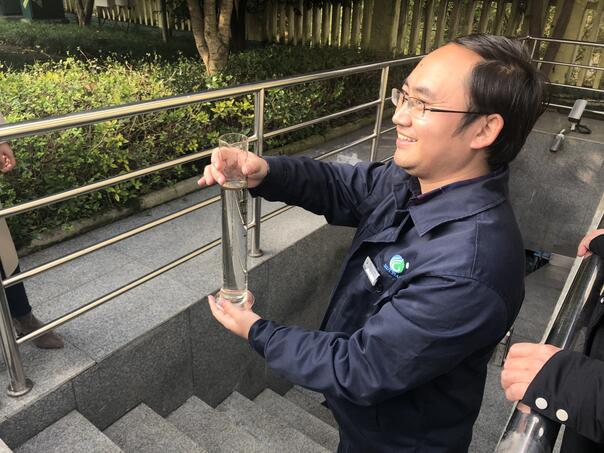 (大竹縣污水處理廠工作人員展示污水處理水質(zhì)標(biāo)準(zhǔn))